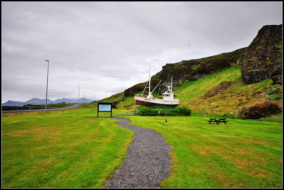第五天最后一站是位于斯奈山半岛西部的小镇欧拉夫斯维克(Olafsvík)。这个小镇的特色景点是欧拉夫斯维克教堂(Olafsvíkurkirkja),这是一座极具艺术设计风格的教堂,设计大师 Hákon Hertervig 的杰作。其设计灵感是用尖顶来接受来自宇宙的信号,而造型,则是冰岛作为岛国所经常使用的帆船。其别具一格的形状与色彩离小镇很远的地方就看得到。教堂旁边有一个正式的草坪球场,当地青少年正在这个球场进行足球训练。正值冰岛足球队首次打入2018年俄罗斯世界杯,很是应景。进入小镇之前的路旁还能看到一艘已经退役的渔船,矗立在山脚下,船头对准大海,准备扬帆出海的样子,据说是当地渔民捐赠给这个小镇,用来纪念这个渔港小镇的渔业发展。